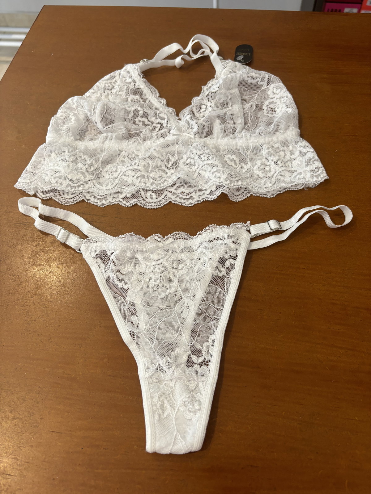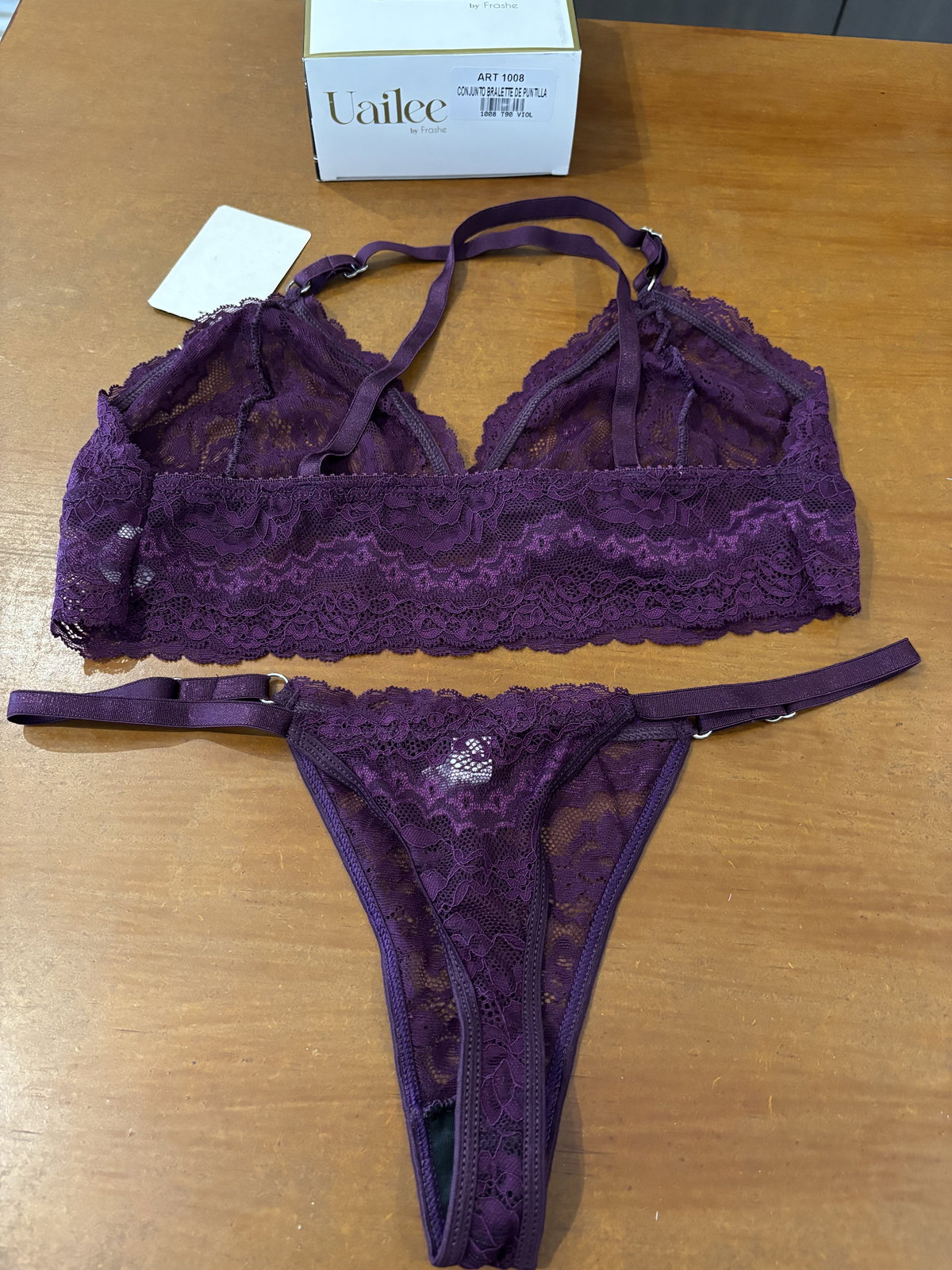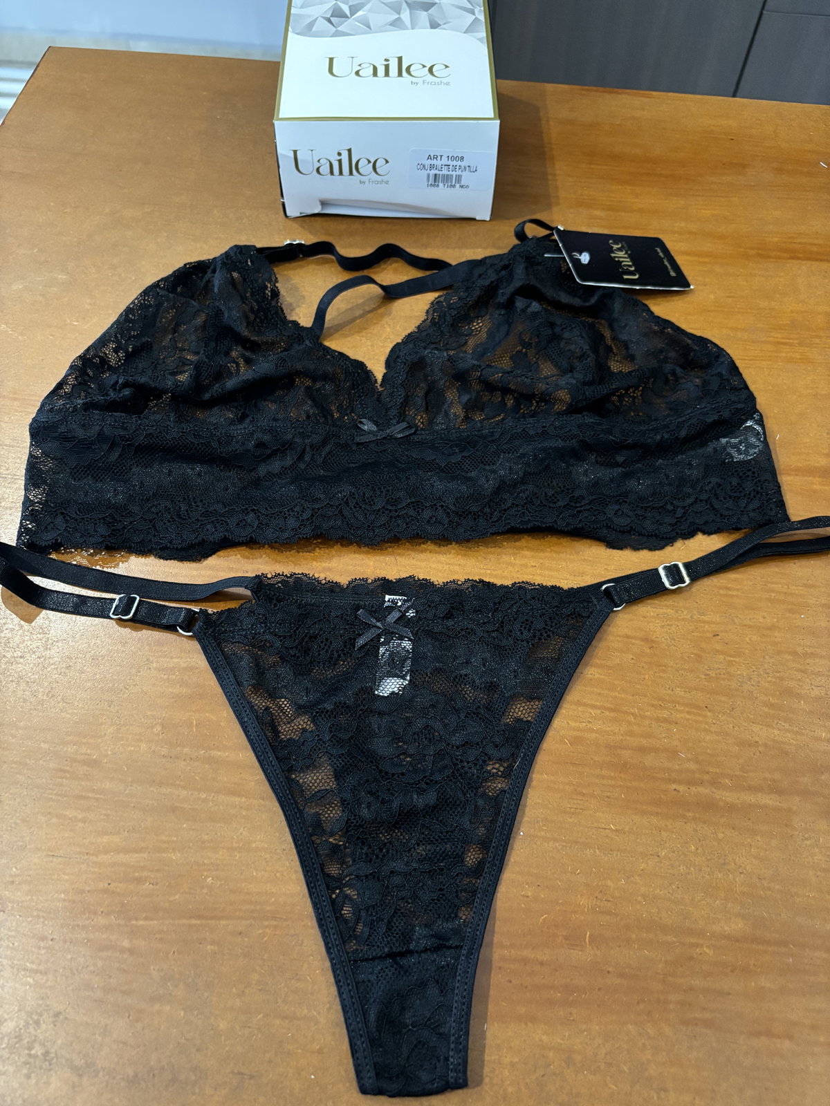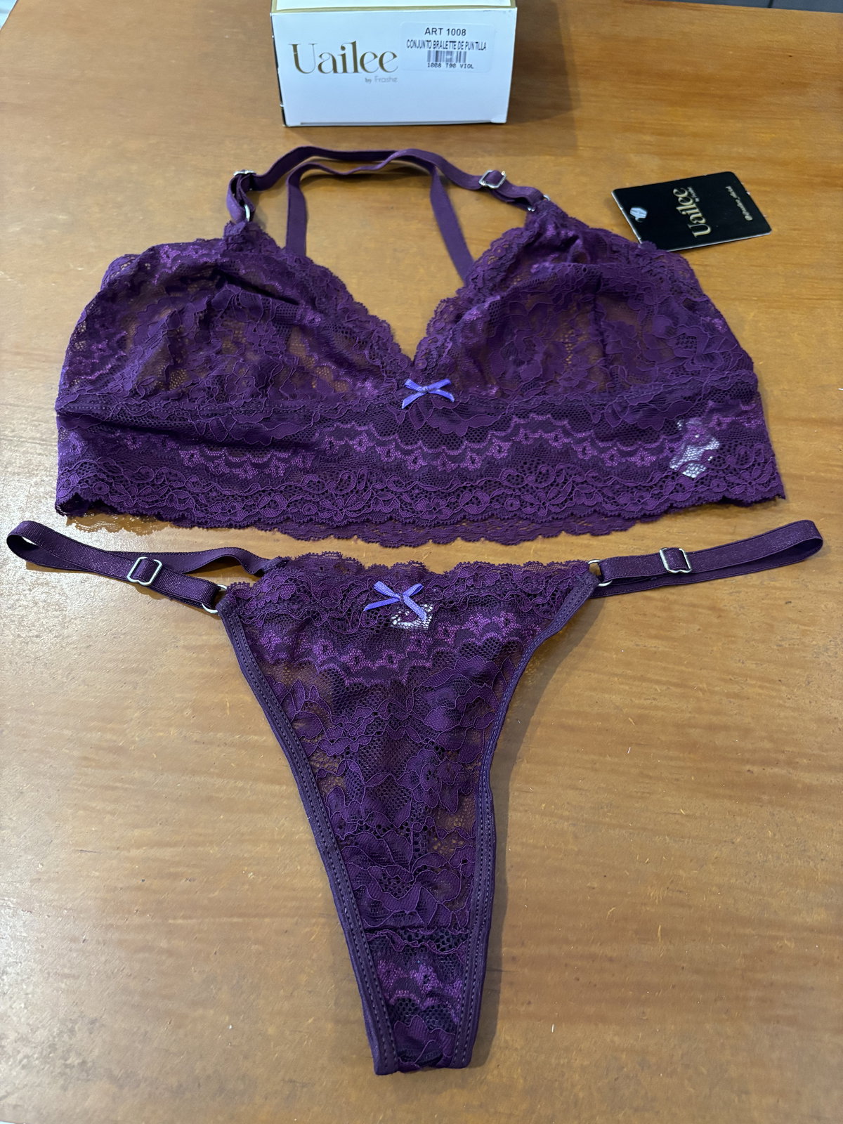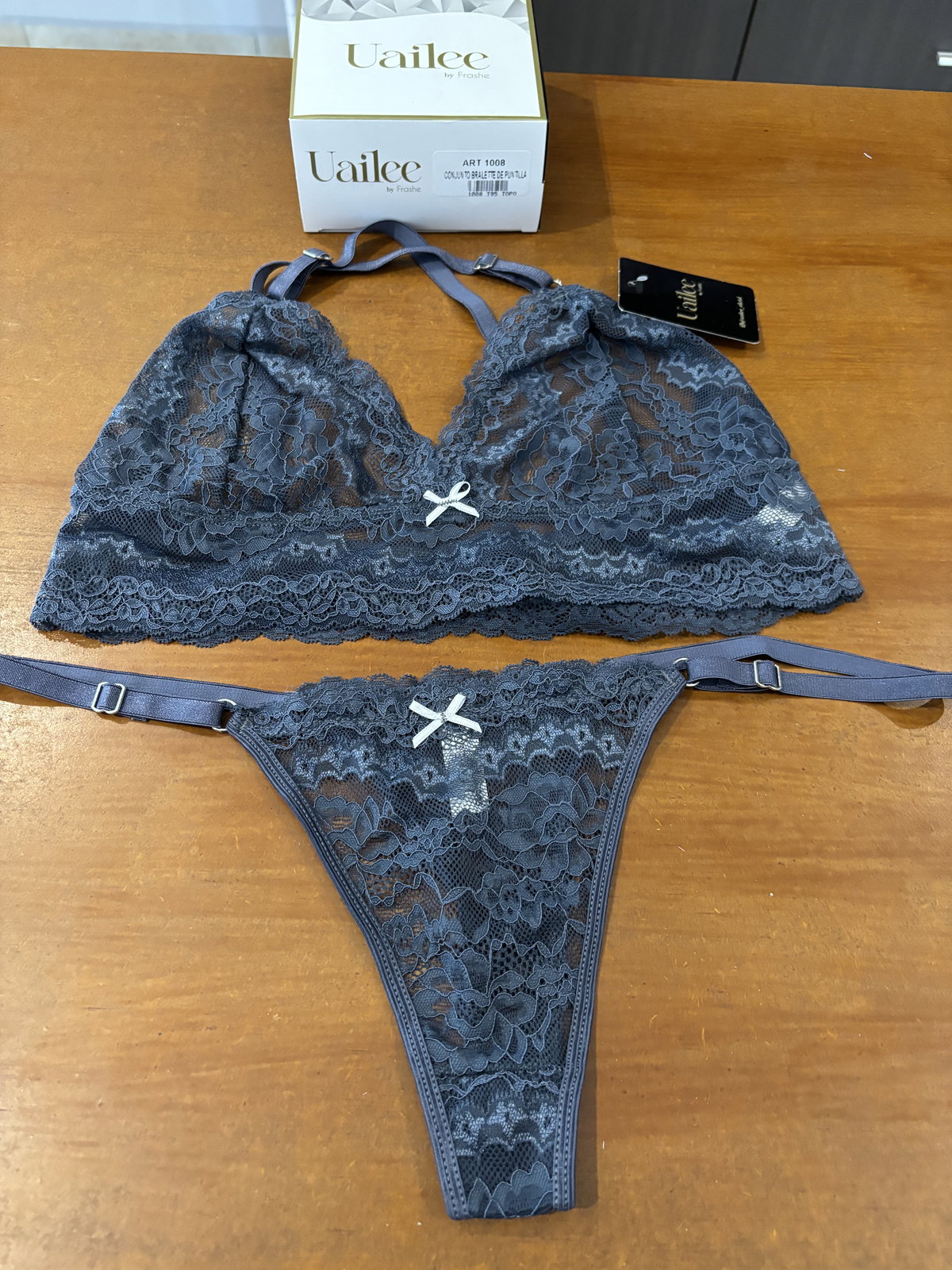 Conjunto delicado y moderno confeccionado en puntilla suave y elastizada. El bralette tipo top ofrece un calce cómodo y natural, con breteles cruzados en la espalda que aportan un toque distintivo y elegante.