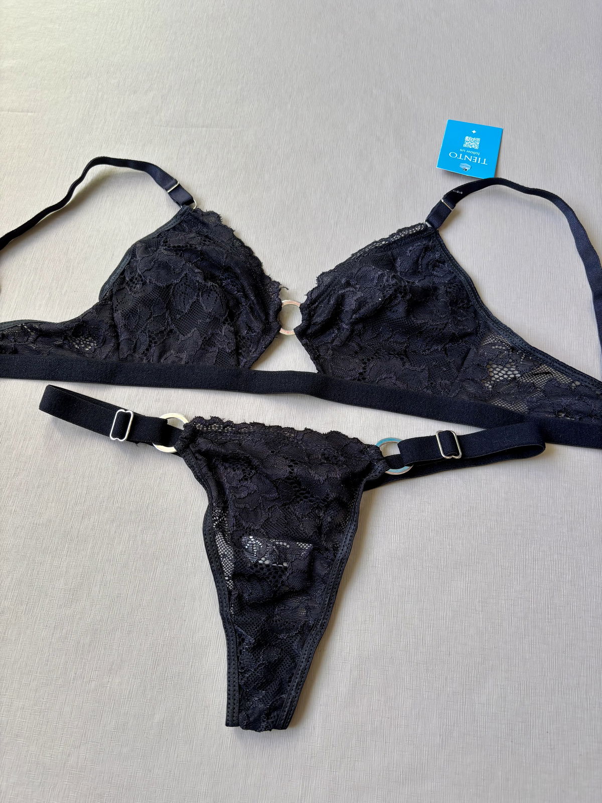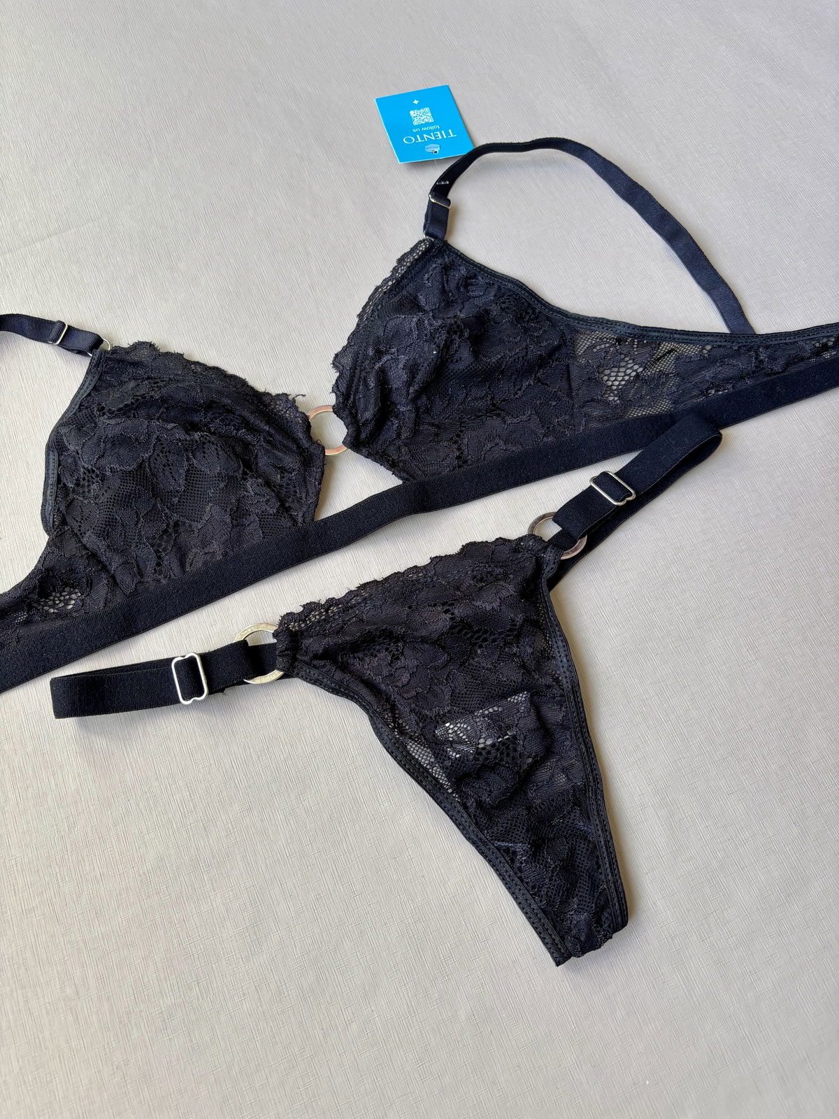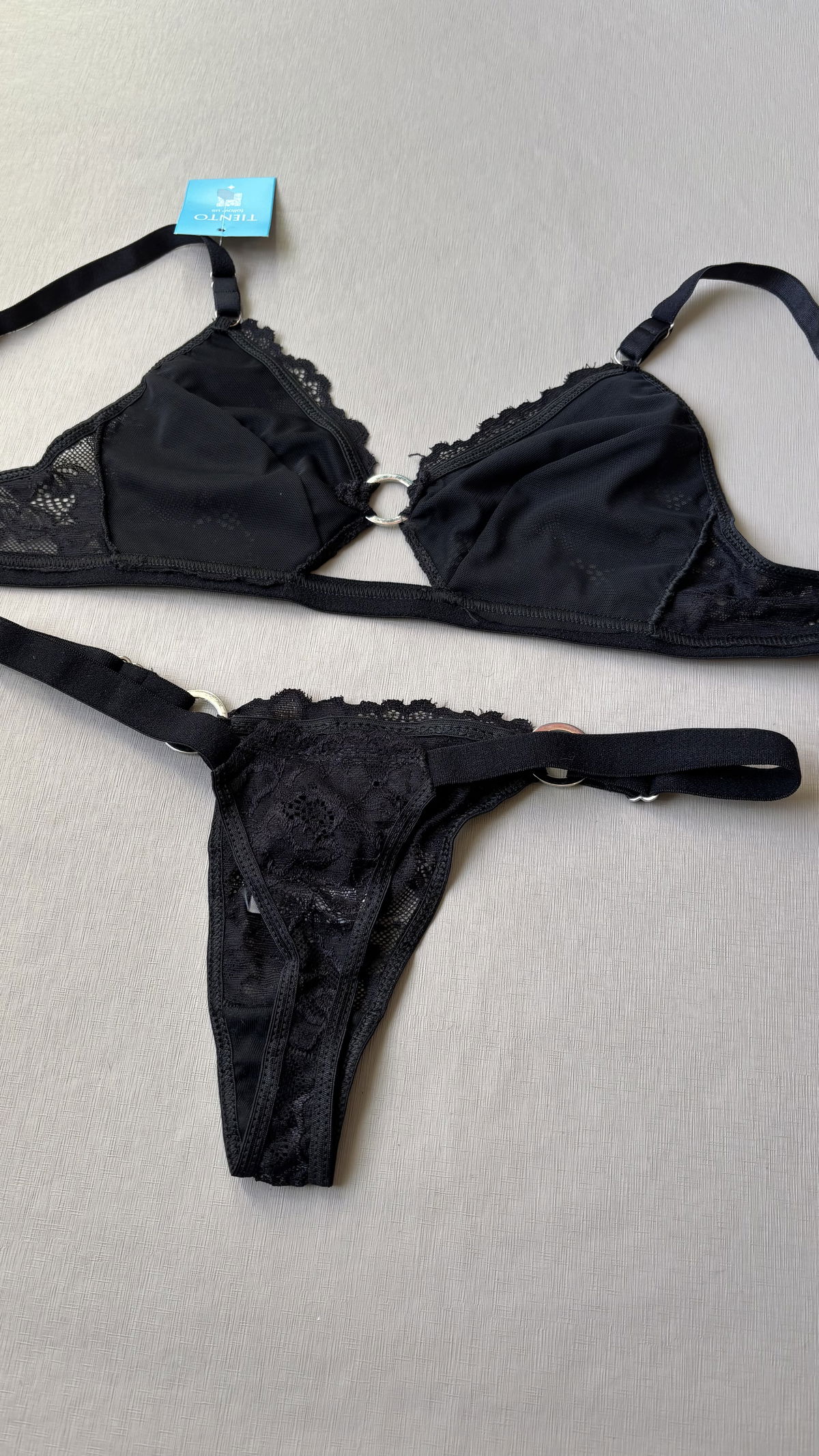 Conjunto delicado y sensual confeccionado en puntilla suave y elastizada. El bralette forrado ofrece un calce cómodo, con base que aporta mayor seguridad sin perder suavidad. Detalle de argollas metálicas