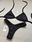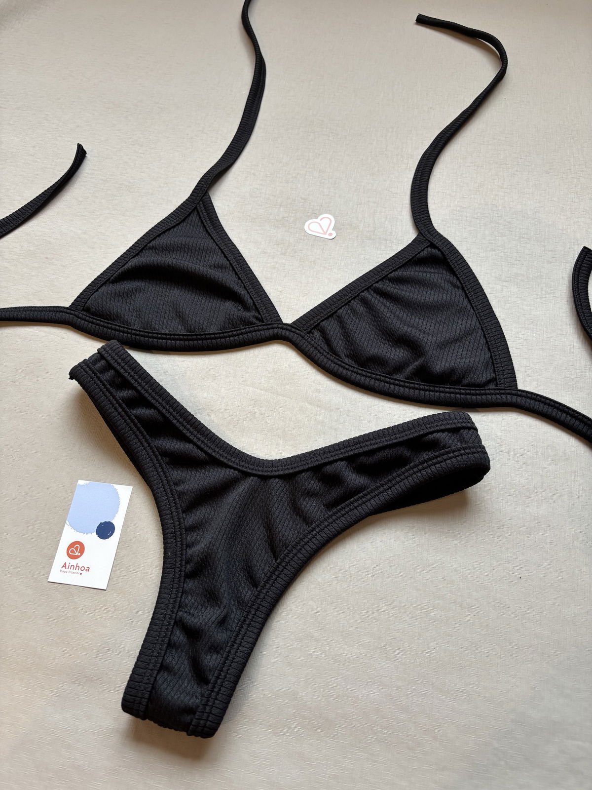 Bikini estilo triangulito con diseño moderno y detalles distintivos. El corpiño cuenta con breteles para atar y tazas soft desmontables, permitiendo ajustar el calce y usarlo con o sin realce.