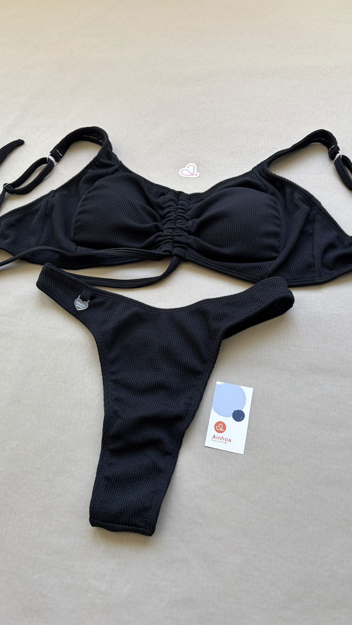 El corpiño tipo top forrado incluye una tira central para fruncir y atar, permitiendo ajustar el escote a tu gusto. Cuenta con breteles regulables, espalda para atar y tazas soft desmontables, lo que brinda mayor comodidad y la posibilidad de usarlo con o sin realce.